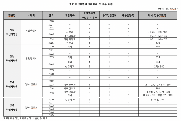 영주적십자병원은 상황이 더 심각합니다. 신경외과는 2020년부터 2023년까지 1천12일 동안 휴진했고, 내과도 지난해부터 올해까지 309일간 진료가 중단됐습니다. 병원 측은 2020년에만 8차례 공고를 내며 연봉 3억9천만 원을 제시한 끝에 의사를 채용했습니다.