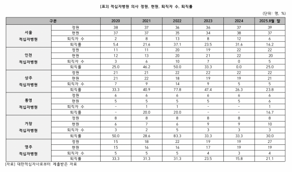 영주적십자병원도 비슷한 상황입니다. 올해 기준 정원 27명 중 8명이 부족해 정상 진료에 어려움을 겪고 있으며, 최근 5년간 평균 퇴직률은 26%를 넘습니다.