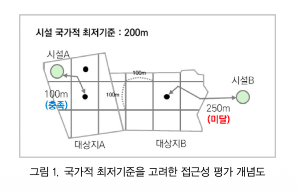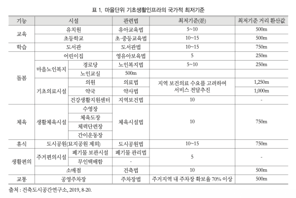 국가 기준은 어린이집·경로당 250m, 유치원·초등학교·소매점·공영주차장 500m, 도서관·생활체육시설·근린공원 750m, 약국 1천m, 의원 1천250m 이내 접근을 ‘보행 가능한 생활권’으로 정의합니다.
