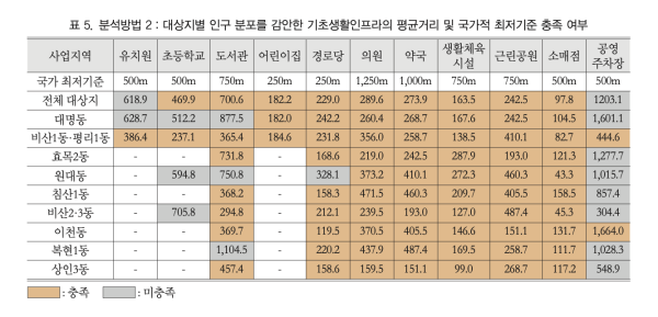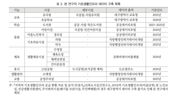한국도시지리학회지에 실린 ‘대구시 도시재생사업 지역을 대상으로 한 기초생활 인프라의 보행 접근성 평가’에 따르면 지난해 도시재생이 완료된 대구 9개 지역의 기초생활 인프라 접근성을 100m 격자 단위로 분석한 결과, 보육·교육·공영주차장 등 주민 생활의 핵심 인프라가 국가 최저기준을 충족하지 못하는 지역이 7곳에 달하는 것으로 조사됐습니다.