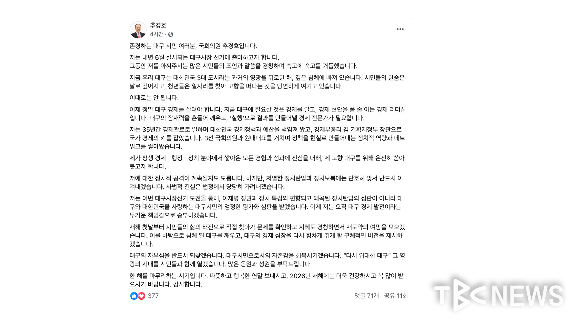 추 의원은 "제가 평생 경제·행정·정치 분야에서 쌓아온 모든 경험과 성과에 진심을 더해 제 고향 대구를 위해 온전히 쏟아붓고자 한다"며 출마를 공식선언했습니다.