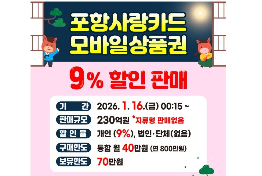 포항시는 2026년 포항사랑상품권의 첫 할인 판매를 오는 16일 모바일 앱과 시내 104개 판매 대행 금융기관에서 시작합니다.